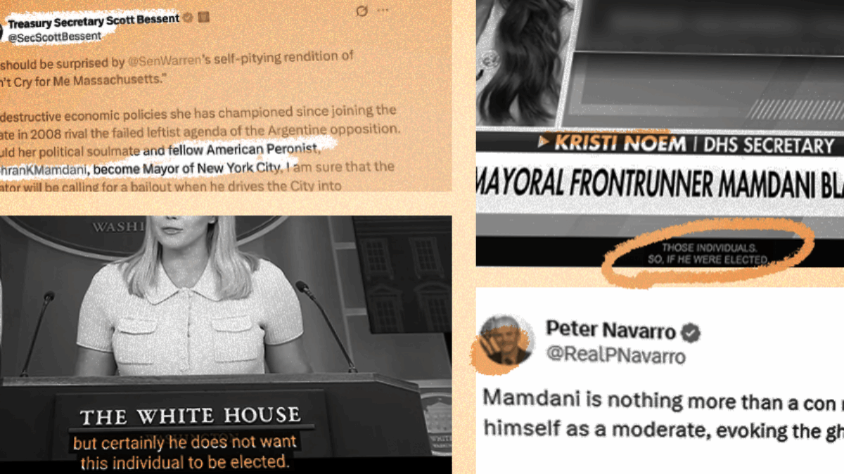 In addition to Leavitt and Bessent, Homeland Security Secretary Kristi Noem made comments during a television interview in her official capacity, including saying that “[i]f [Mamdani] were elected, New York City would be a train wreck and those poor families would have nowhere to go for help.” White House Senior Counselor for Trade and Manufacturing Peter Navarro has also posted numerous criticisms of Mamdani on his X account, which prominently identifies him by his government title.