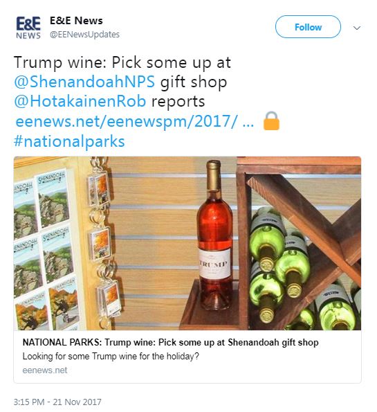 Nor is the promotion of the Trump brand exclusive to the White House. Federal agencies and members of Congress also gave President Trump’s businesses a boost during his first year in office. For example, in April, the State Department posted a story on its ShareAmerica website promoting Mar-a-Lago as the “winter White House.” In November, E&E News reported that Shenandoah National Park was selling wine from the Trump Winery in its gift shop. And in December, Sen. Lindsey Graham (R-SC) praised the Trump International Golf Club – West Palm Beach using his official Twitter account, commenting, “Trump International Golf Club is a spectacular golf course.”