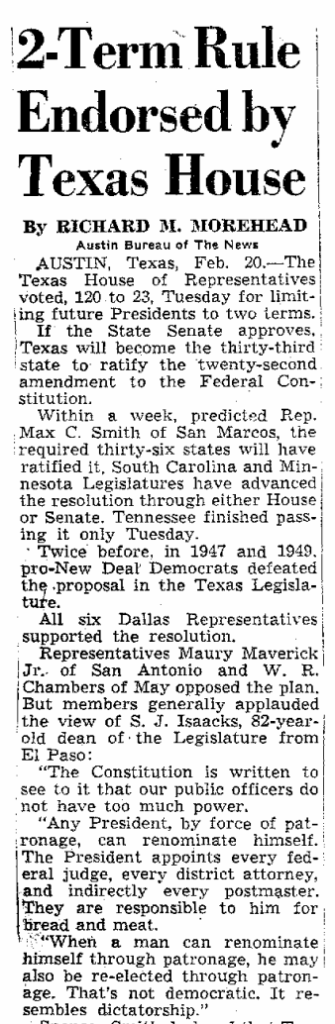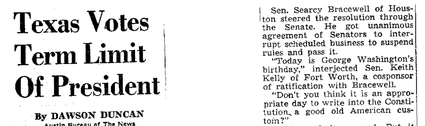- A column in the Dallas Morning News following the House’s passage of the Joint Resolution described the merits of the 22nd Amendment: “Too much power accumulates in the hands of a long-time President. He becomes in time an absolute monarch.”