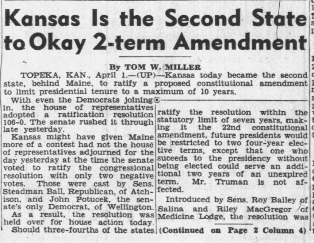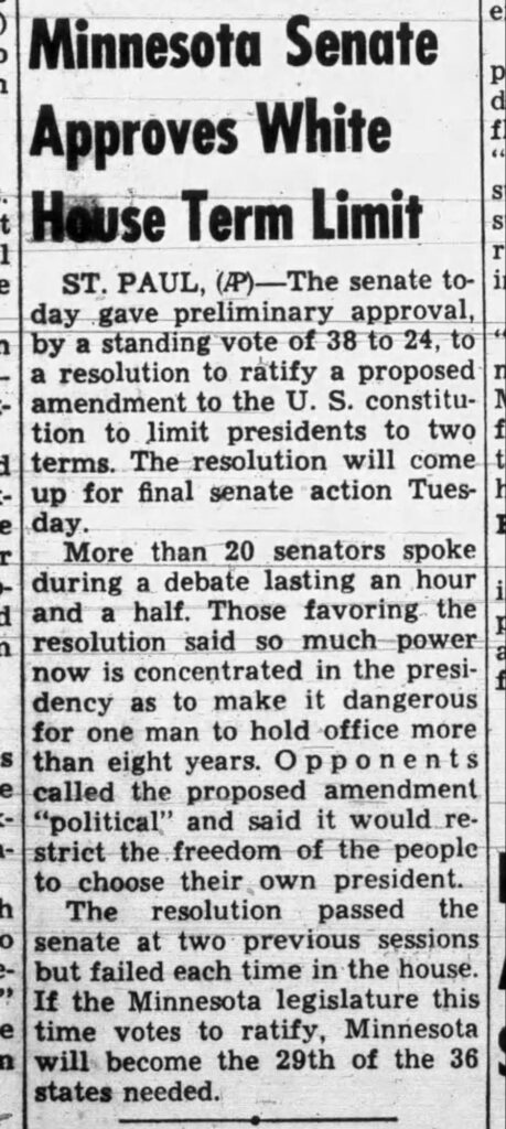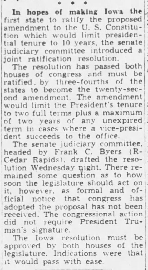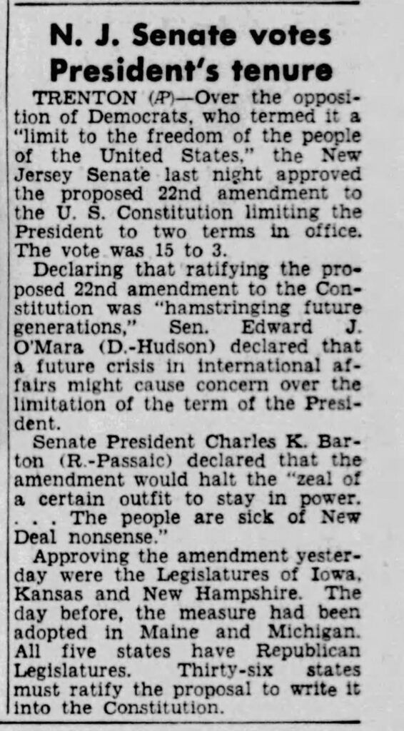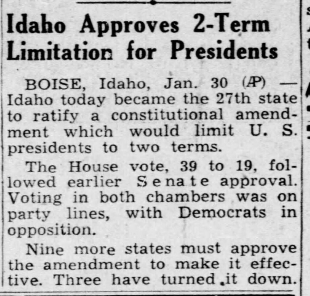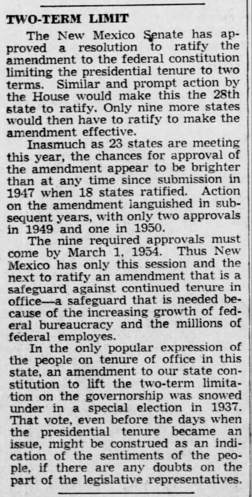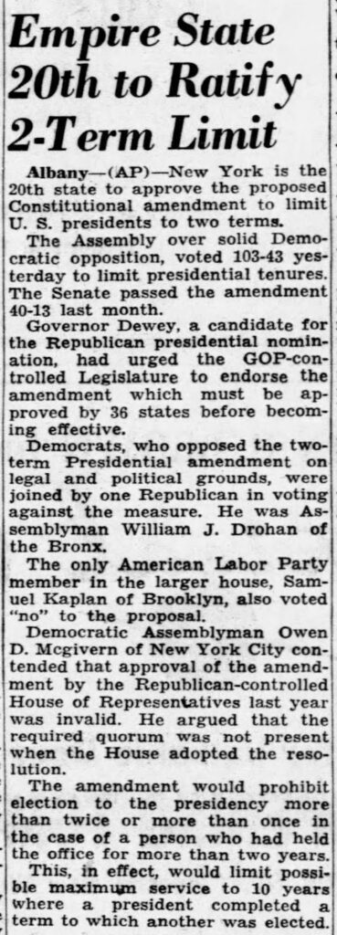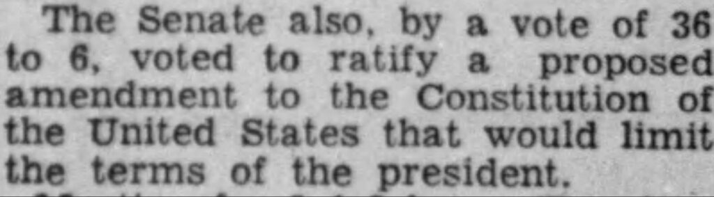 - The editorial added, “In the case of the 22nd amendment now receiving the consideration of the states, it is an amendment born of a fear that the existence of the republic as a republic may be endangered by the presence of any one man too long in the office of chief executive. … It is not inconceivable that, should the amendment become law, the Democrats might find themselves in the position some years hence of being happy that it is on the books.”