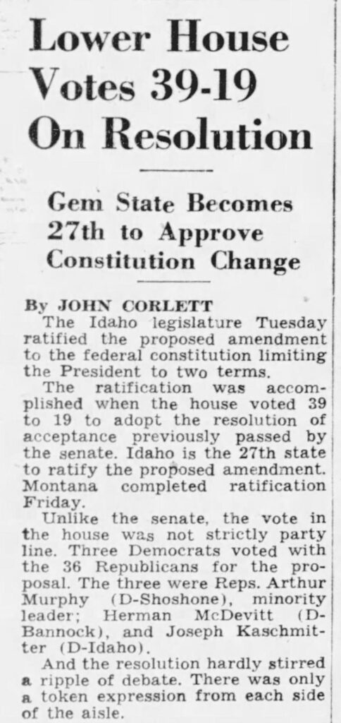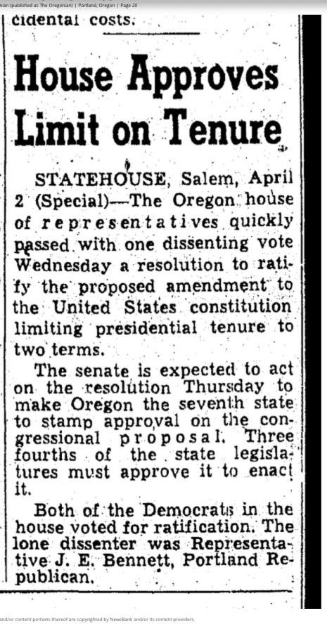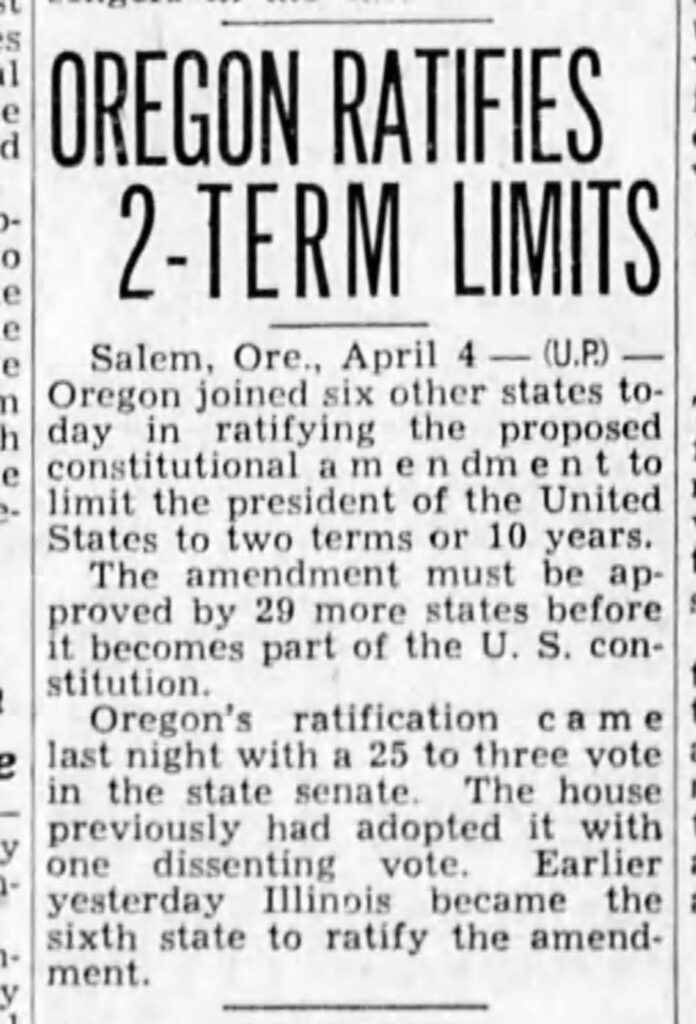 - As Salem’s The Capital Journal explained, “the House approved and sent to the senate Wednesday a resolution to ratify the proposed 22nd amendment to the federal constitution to prevent any president from serving a third term.”