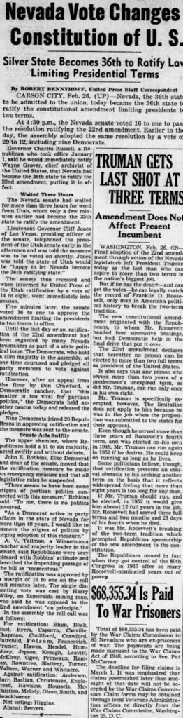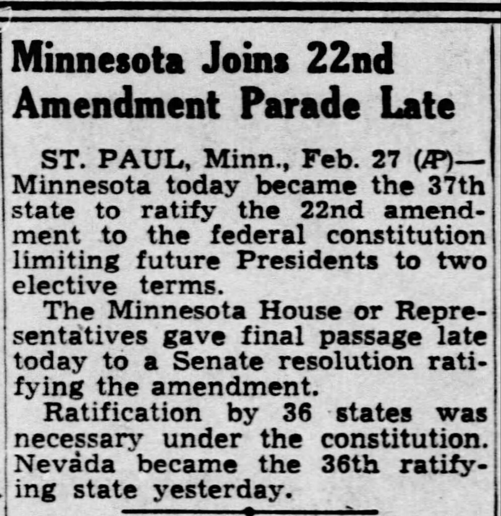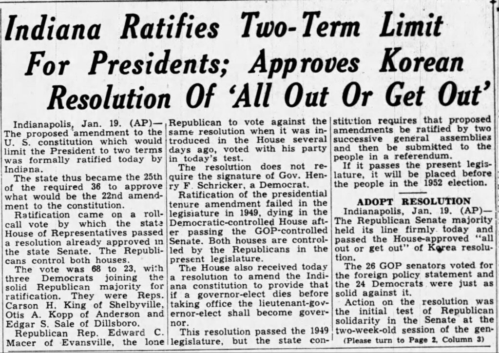 - The Columbus Dispatch speculated that Ohio could become one of the first states to ratify the 22nd Amendment through the “simple procedure” of approval by three-fifths of the state House and Senate.