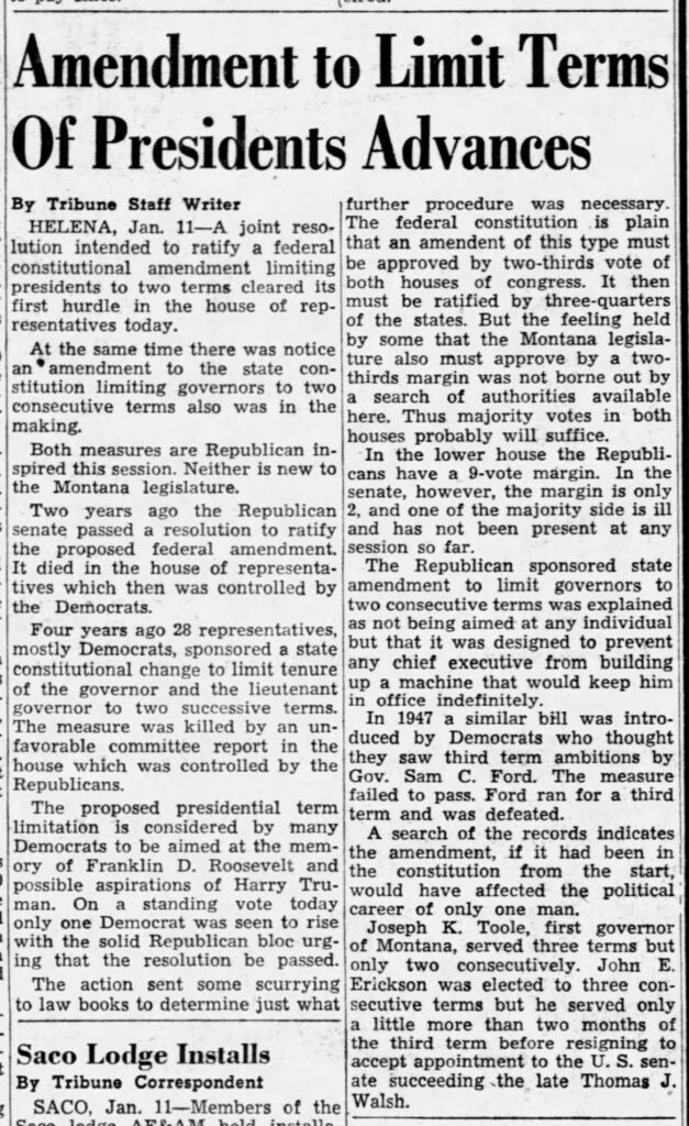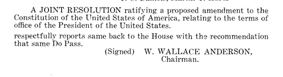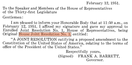 - The governor’s message to the 31st state legislature recommended the joint resolution to pass ratifying the 22nd Amendment.