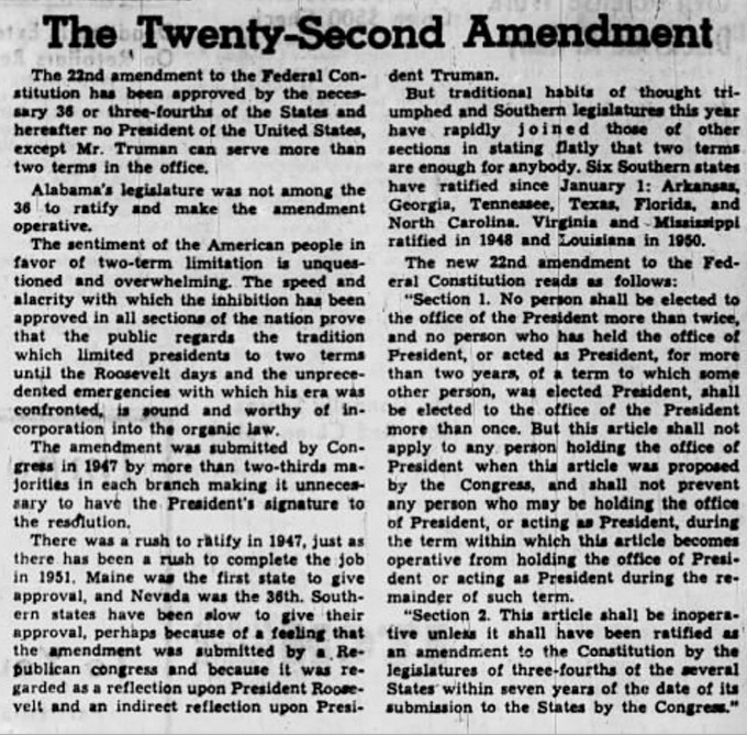 - Earlier that year, the Alabama Journal noted that although the 22nd Amendment had been ratified by 36 states, “Southern states [including Alabama] have been slow to give their approval, perhaps because of a feeling that the amendment was submitted by a Republican Congress and because it was regarded as a reflection upon President Roosevelt and an indirect reflection upon President Truman.”