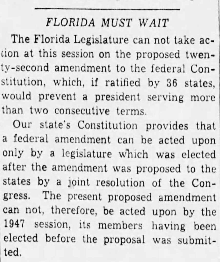 - Due to a quirk of Florida law, the state was never going to be among the first to ratify the amendment. As The Bradenton Herald noted in April 1947, the Florida legislature could not take up the amendment during that legislative session since all of the members had been elected before Congress sent the amendment to the states earlier that year.