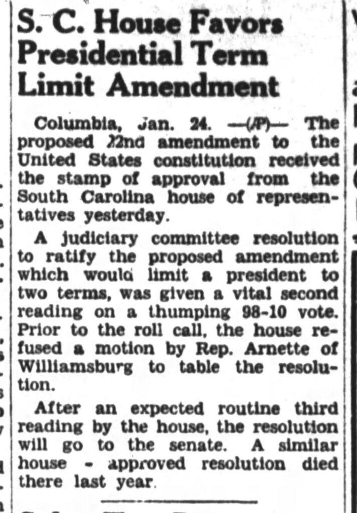 - South Carolina’s legislature completed voting to ratify the 22nd amendment on March 13, 1951.