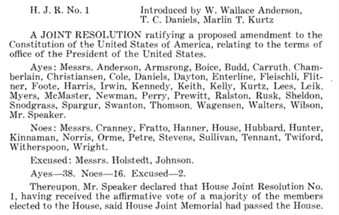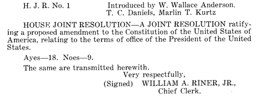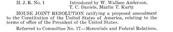 - H.J.R. No. 1, the resolution to ratify the amendment, was introduced by House Republicans W. Wallace Anderson, T.C. Daniels and Marlin T. Kurtz on January 12, 1951.