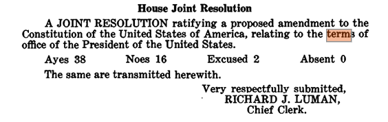 - Following this process, House Joint Resolution No. 1 – “A CONCURRENT RESOLUTION, Ratifying the Proposed Amendment to the Constitution of the United States and Known as the 22nd Amendment to the Constitution of the United States Relating to the Terms of Office of the President” – was “approved” on February 15, 1951.