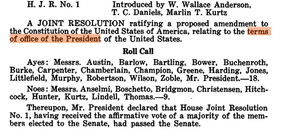 - The Vermont Senate approved the measure, J.H.R. 35 “Joint resolution ratifying a joint resolution of the Congress of the United States of America entitled, ‘Joint Resolution proposing an amendment to the Constitution of the United States relating to the terms of office of the President,” in a concurrence vote on April 15, 1947.