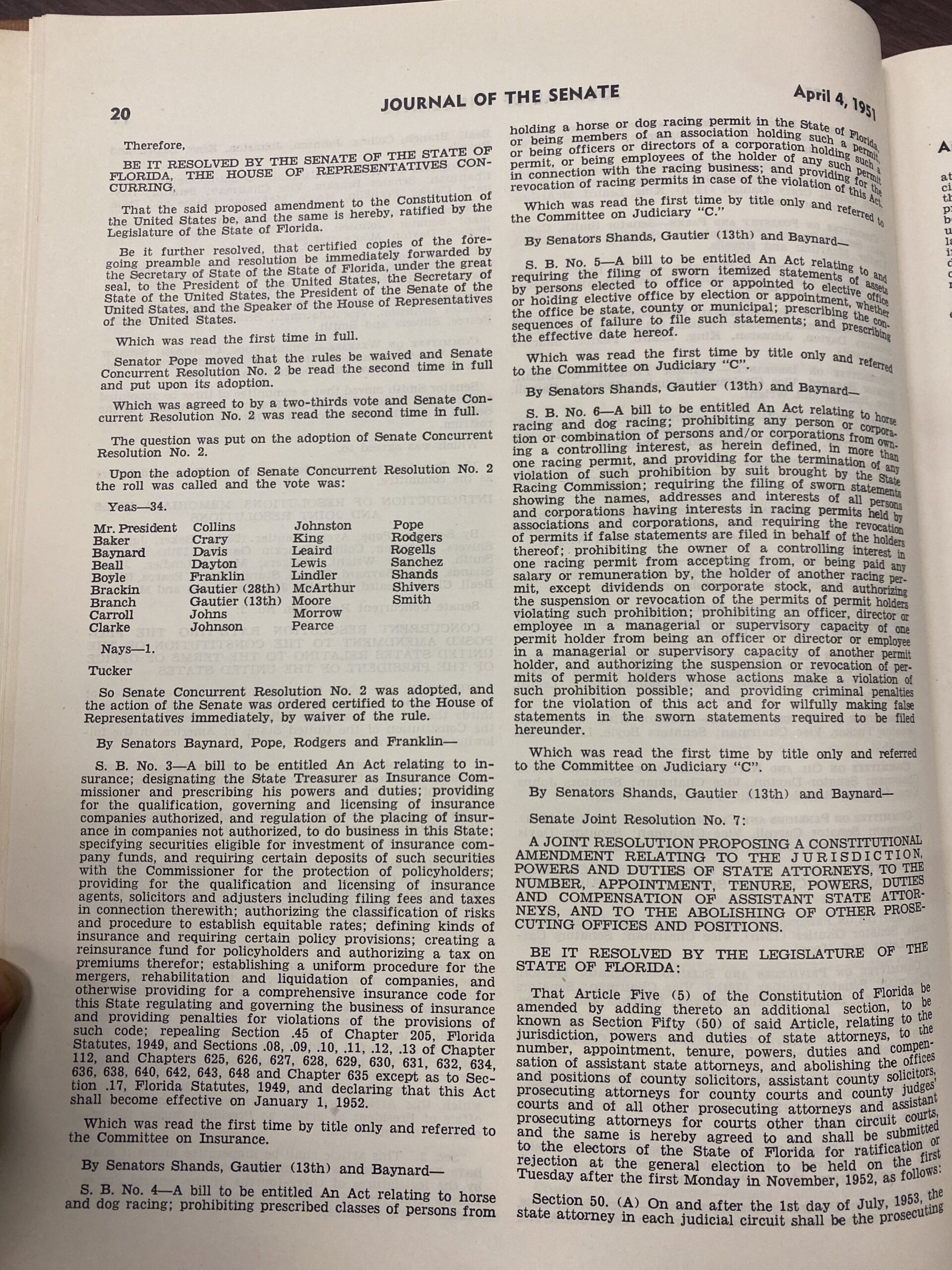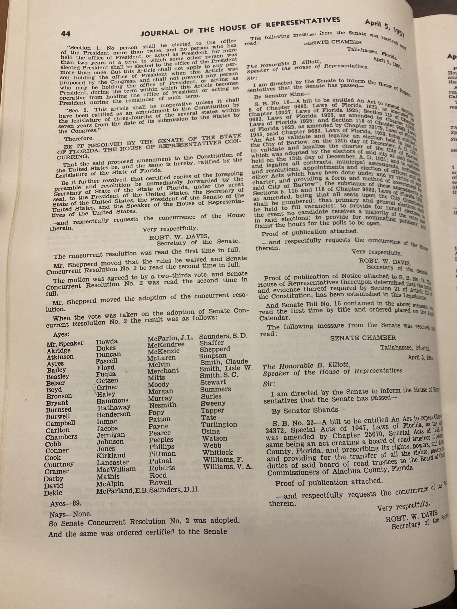- On April 4, 1951, the Florida Senate overwhelmingly voted to approve Senate Concurrent Resolution 2, to ratify the 22nd Amendment by vote of 34 to 1. The only nay vote was Democratic Senator Luther C. Tucker.