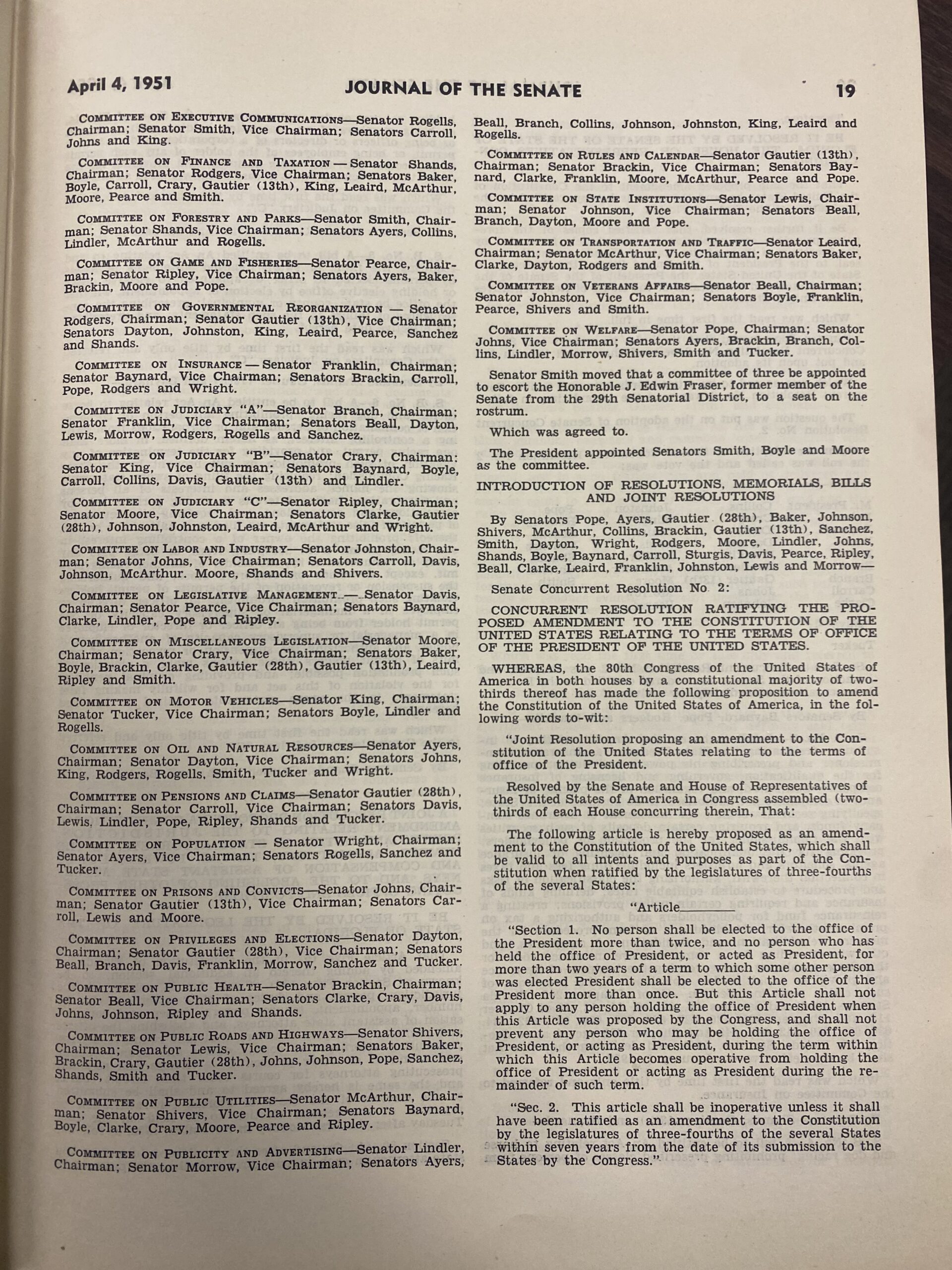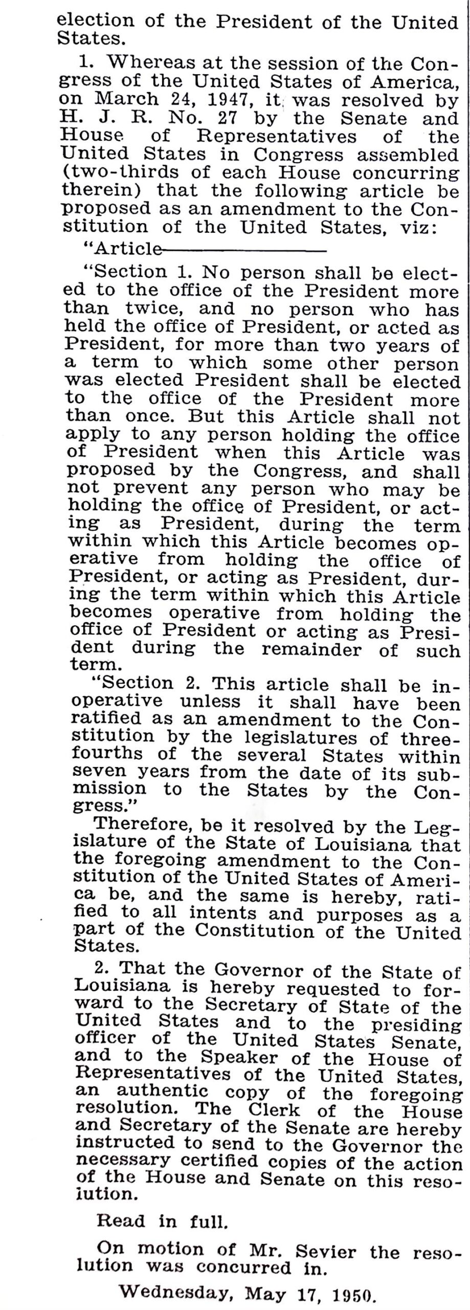 - The governor’s message to the 31st state legislature recommended the joint resolution to pass ratifying the 22nd Amendment.