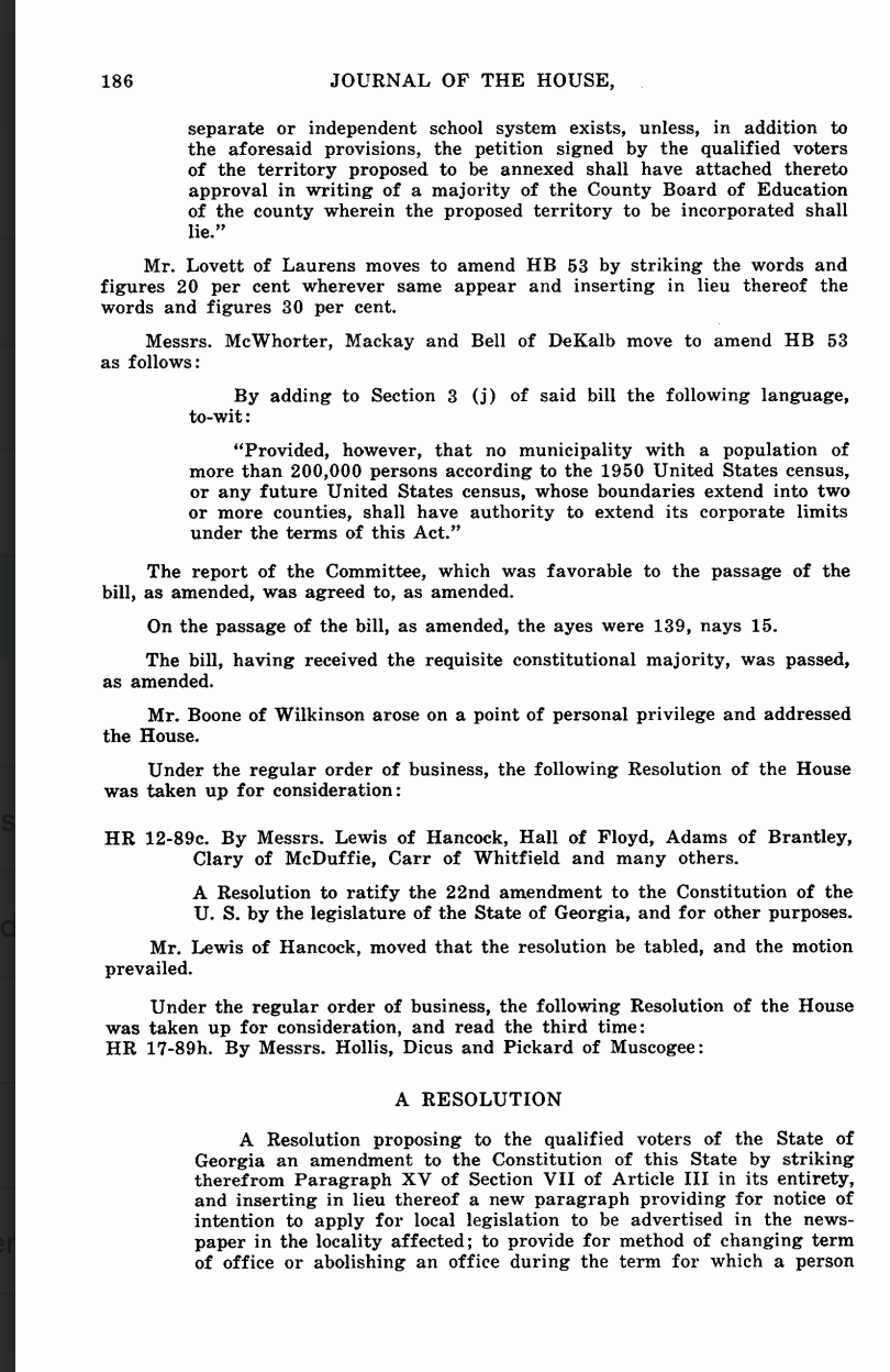 - On January 10, 1951, HR 12-89c, “A Resolution to ratify the Twenty-second amendment to the Constitution of the United States by the Legislature of the State of Georgia”, introduced by several representatives, was referred to the House Committee on Amendments to the Constitution #1.