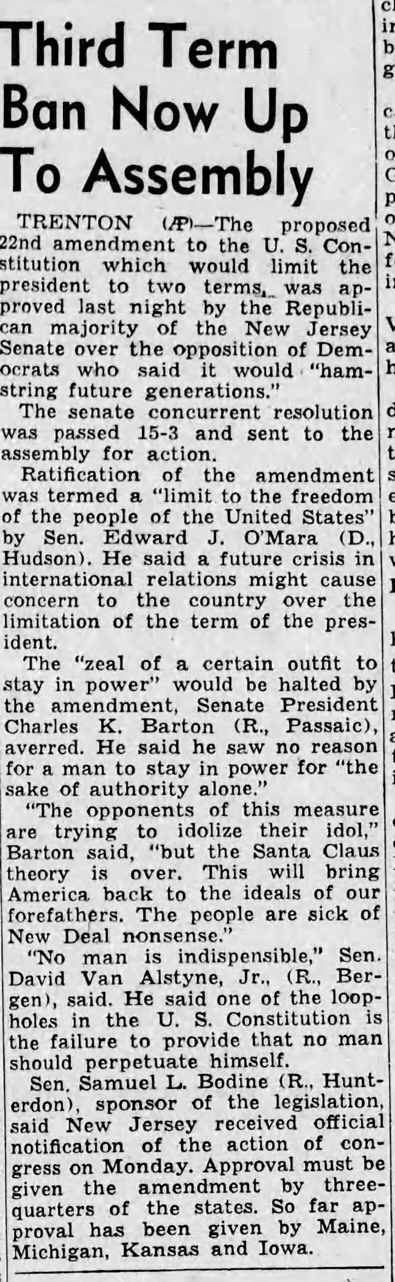 - The editorial added, “In the case of the 22nd amendment now receiving the consideration of the states, it is an amendment born of a fear that the existence of the republic as a republic may be endangered by the presence of any one man too long in the office of chief executive. … It is not inconceivable that, should the amendment become law, the Democrats might find themselves in the position some years hence of being happy that it is on the books.”