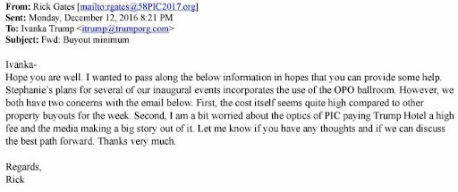 Another email shows that Rick Gates, the inaugural committee deputy chairman, raised concerns with Ivanka Trump about the optics around the cost of using the hotel for the inauguration being “quite high.” It appears not to have changed anyone’s mind about the opportunity to cash in. In December, Gates was sentenced to 45 days in jail for conspiracy and lying to the FBI in the Mueller probe.